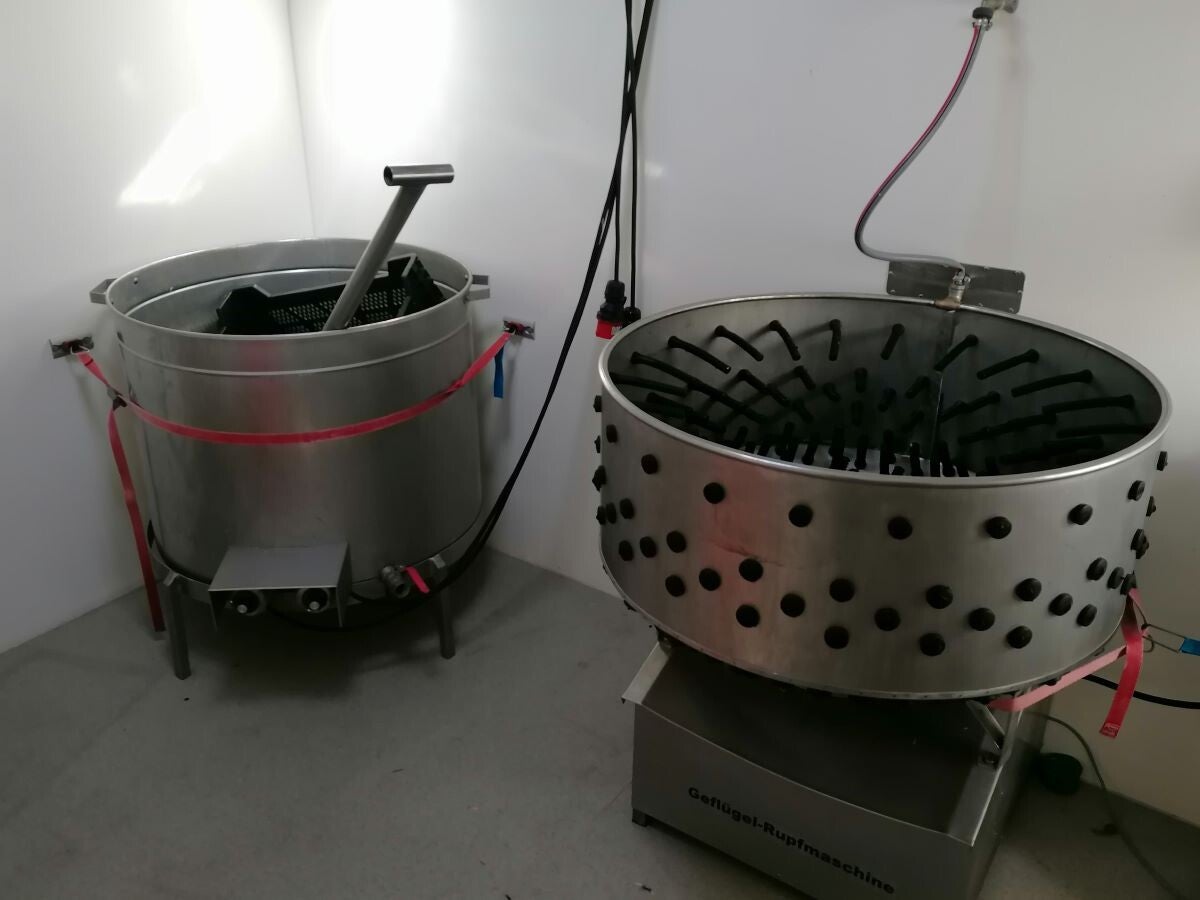 Unser Schlachtprozess beinhaltet die Schlachtung, das Rupfen und das Ausnehmen des Geflügels. Die Schlachtkörper werden unverpackt in hofeigenen Behältern an Sie übergeben. Bitte beachten Sie, dass Sie als Auftraggeber für die Kühlung und Verpackung verantwortlich sind.